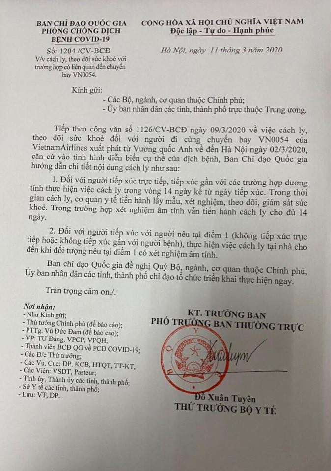 Công văn số 1204 /CV-BCĐ gửi các Bộ, ngành, cơ quan thuộc Chính phủ; Chủ tịch UBND các tỉnh, thành phố về việc cách ly, theo dõi sức khoẻ với trường hợp có liên quan đến chuyến bay VN0054
