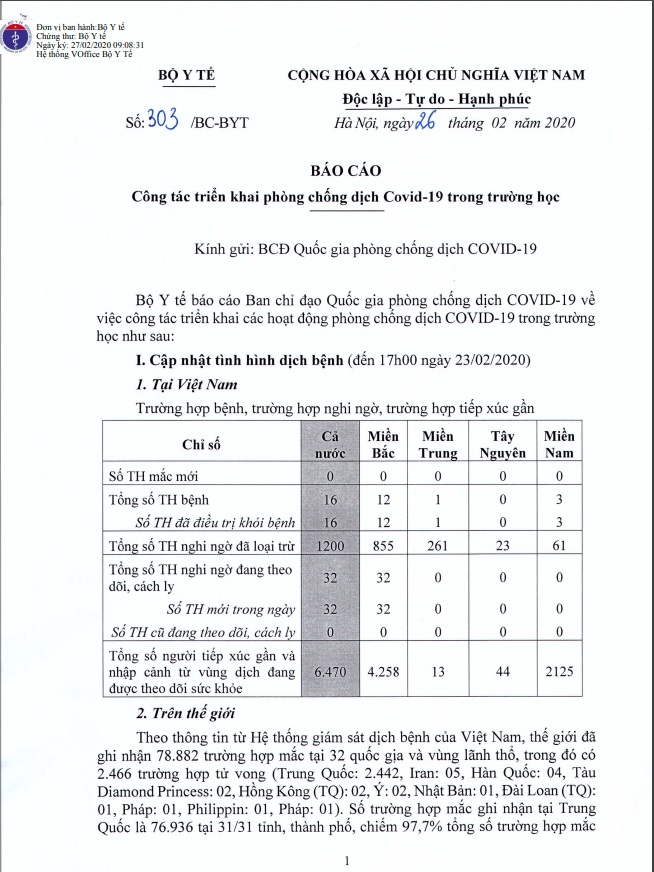 Thứ Tư, ngày 26/02/2020 08:48Công văn 303/BC-BYT về công tác triển khai phòng, chống dịch Covid - 19 trong trường học