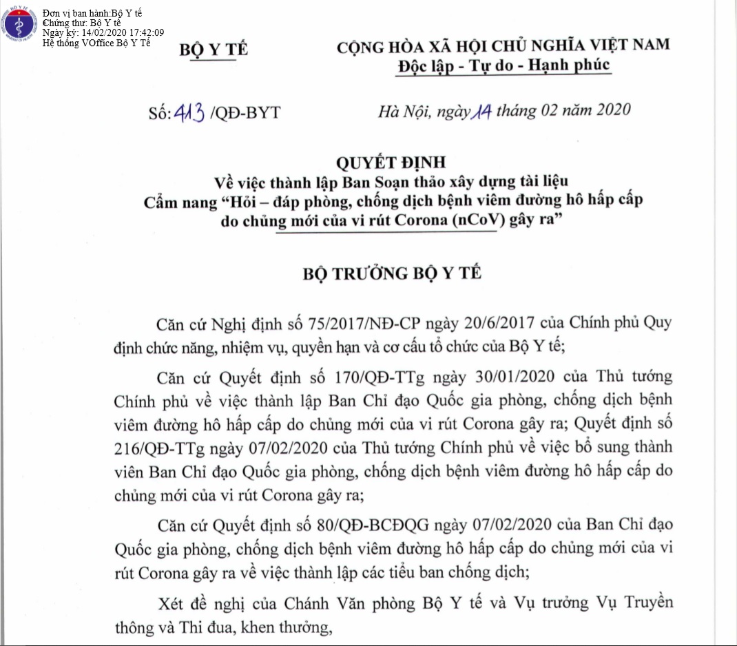 Công văn 413/QĐ-BYT về việc thành lập ban soạn thảo xây dựng tài liệu cẩm nang Hỏi- đáp, phòng chống dịch viêm đường hô hấp cấp do chủng mới của vi rút corona gây ra