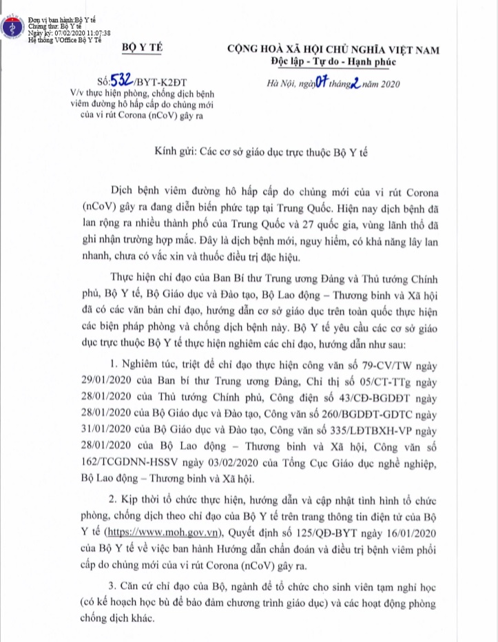 Công văn số 566/BYT-DP ngày 08/02/2020 Vv Tăng cường phòng, chống dịch bệnh viêm đường hô hấp cấp do nCoV tại cơ sở giáo dục, trường học.
